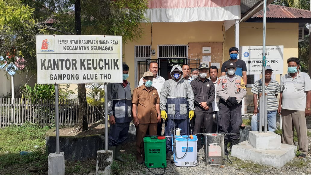 NT, Suka Makmue-Aparatur Desa Alue Tho Kecamatan Seunagan Kabupaten Nagan Raya, Aceh mulai melakukan penyemprotan desinfektan untuk pencegahan virus corona di desa itu, Senin, (30/3/2020).