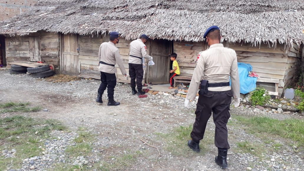 Personil kompi 3 Batalyon C Pelopor Satbrimob Polda Aceh beserta Bhayangkari membagikan menu berbuka puasa dan takjil untuk kaum dhuafa dan anak yatim di Dusun Muhajirin Desa Ujong Patihah Kecamatan Kuala Kabupaten Nagan Raya, Aceh, Jumat, (1/5/2020) sore.