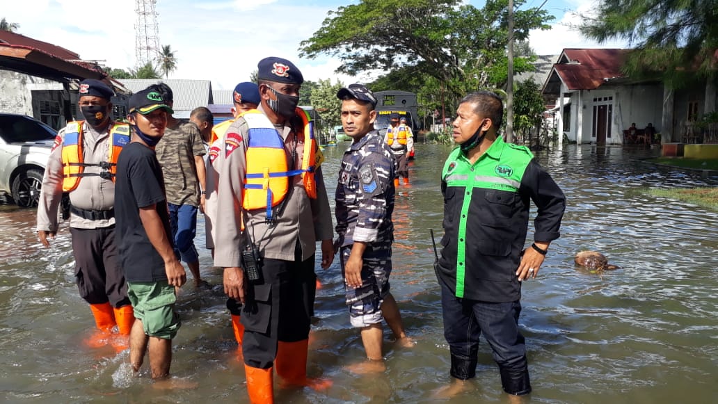 Dalam upaya Evakuasi korban Luapan Air laut personil Brimob bekerja sama dengan Personil Polres Aceh Barat, Kodim Aceh Barat dan BPBD Aceh Barat.