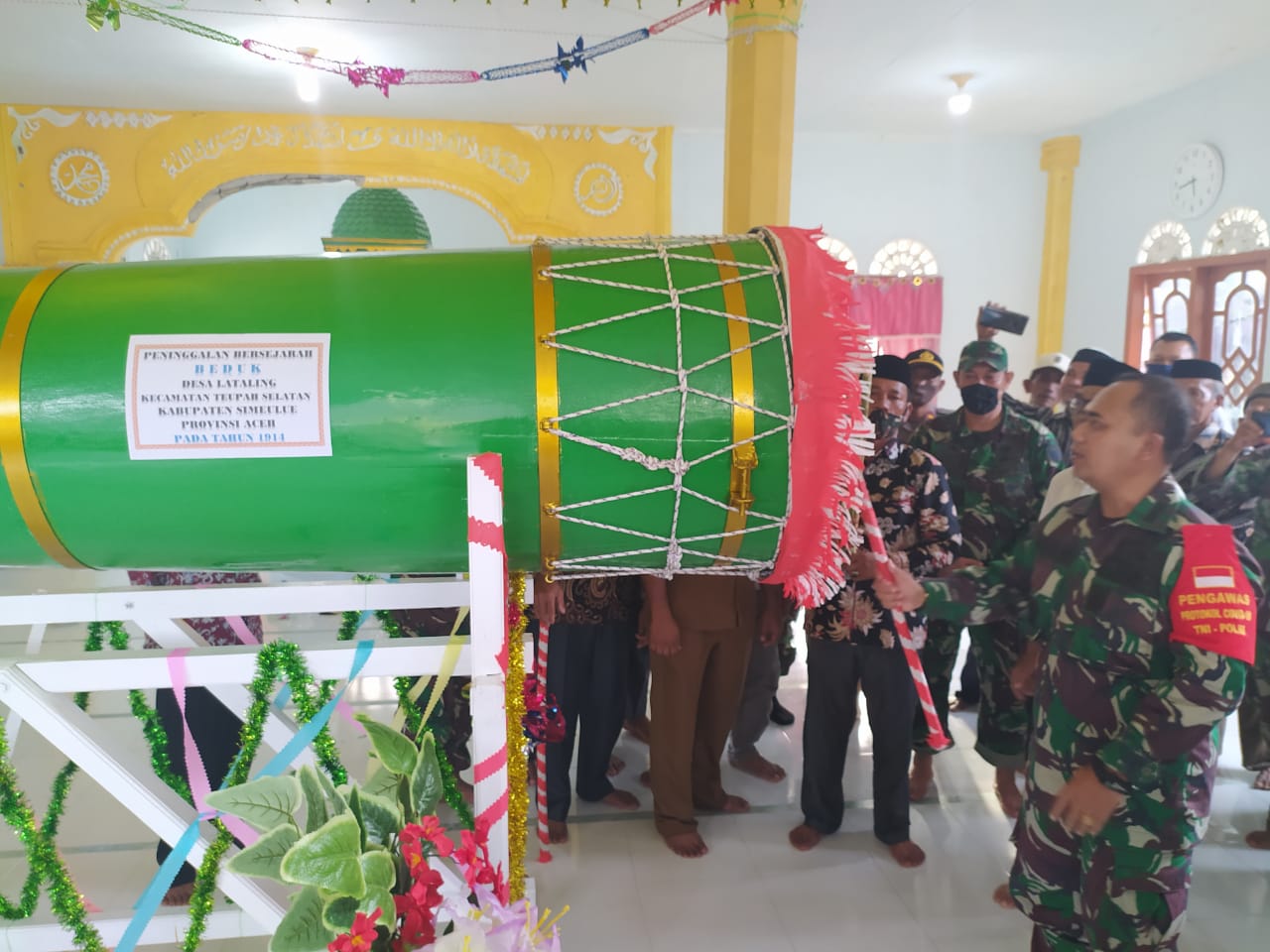 “Kedatangan Dandim 0115/Simeulue di awal waktu pengecekan pertama Kali, Posisi bedug memang dalam keadaan tidak terawat atau kulit binatang yang berfungsi sebagai membran atau selaput gendang Rusak. Dengan memberi motivasi Kepada warga Masyarakat dan di Bantu oleh Koramil 03/Teupah Selatan