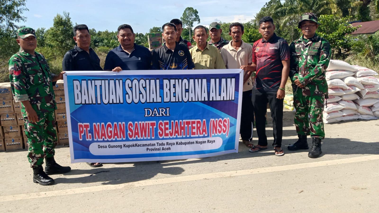 PT Nagan Sawit Sejahtera yang beralamat di Desa Gunong Kupok melalui Drima Bukit kepada Camat beserta Kepala Desa dan Danposramil beserta personil menyerahkan bantuan dari perusahaan untuk masyarakat yang terkena dampak banjir di daerah tersebut.