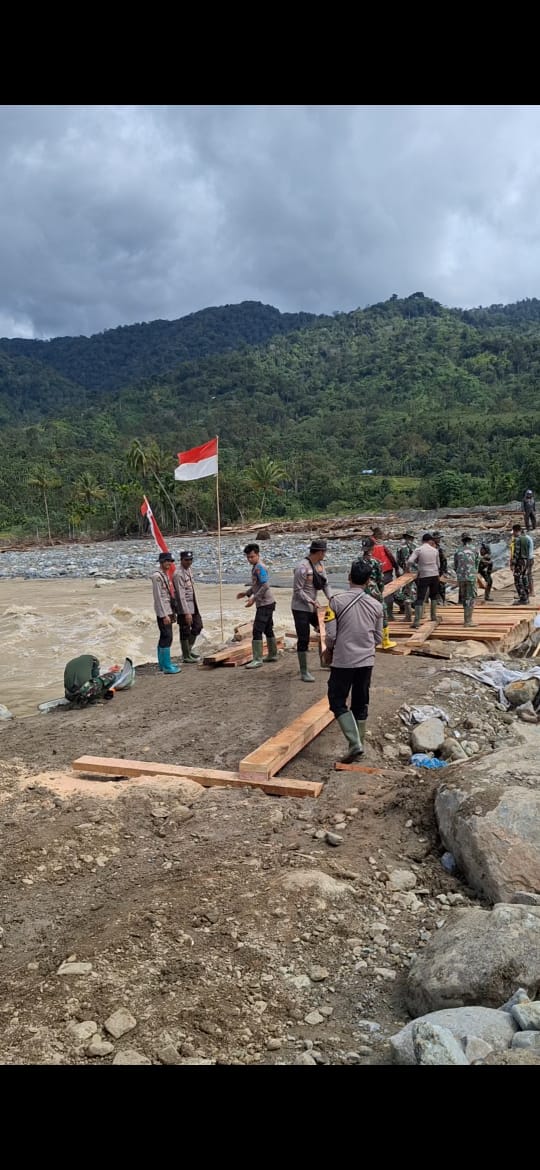 Kapolres Nagan Raya melalui petugas Posko Bencana menyampaikan bahwa pembangunan jembatan darurat ini merupakan bentuk kepedulian dan sinergi antara Polri, TNI, dan masyarakat dalam percepatan pemulihan pascabencana banjir.