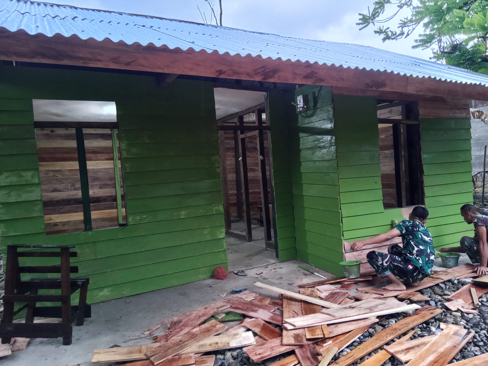 Kegiatan perehaban berlangsung Rabu (4/3/2026) dengan pembagian tugas yang rapi. Sebagian personel memperbaiki struktur dinding, sementara lainnya melakukan pengecatan. Warna hijau yang menghiasi rumah menjadi tanda kehadiran TNI yang membawa semangat baru.